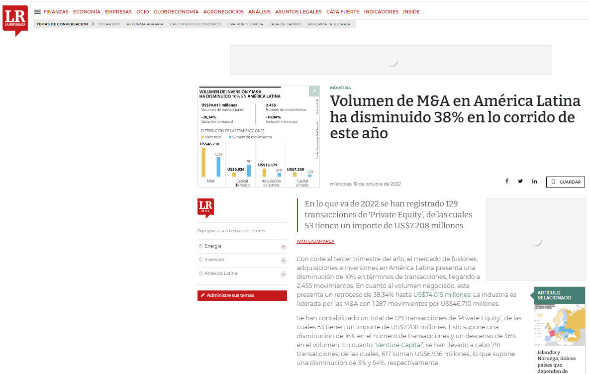 En lo que va de 2022 se han registrado 129 transacciones de ‘Private Equity’, de las cuales 53 tienen un importe de US$7.208 millones