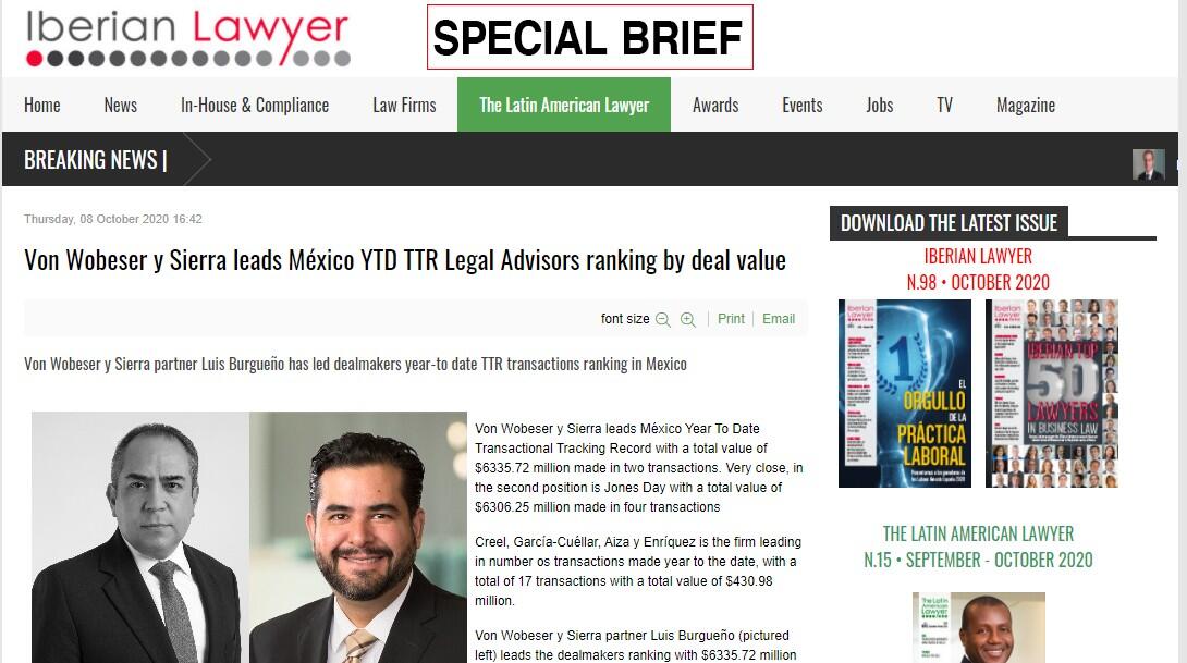 Von Wobeser y Sierra leads México YTD TTR Legal Advisors ranking by deal value
