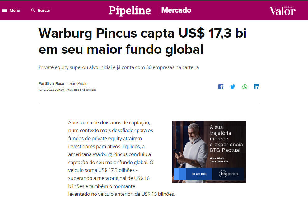 Após cerca de dois anos de captação, num contexto mais desafiador para os fundos de private equity atraírem investidores para ativos ilíquidos, a americana Warburg Pincus concluiu a captação do seu maior fundo global. O veículo soma US$ 17,3 bilhões - superando a meta original de US$ 16 bilhões e também o montante levantado no veículo anterior, de