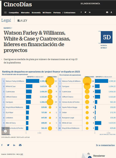 El despacho internacional de abogados Watson Farley & Williams (WFW) lidera el ranking en asesoramiento de financiación de proyectos (project finance) en España en 2023 de la plataforma TTR Data. La oficina española del bufete británico arrasa en la clasificación tanto por el valor total de las transacciones (casi 3.400 millones de euros) como por el número de operaciones (32). El primer podio lo completan White & Case (1.623 millones) y Cuatrecasas (1.456 millones).