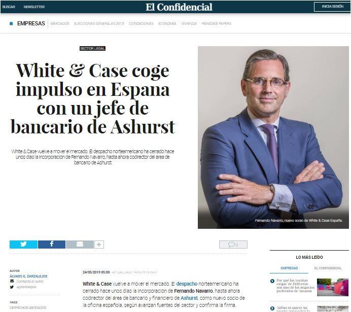 White & Case vuelve a mover el mercado. El despacho norteamericano ha cerrado hace unos días la incorporación de Fernando Navarro, hasta ahora codirector del área de bancario de Ashurst