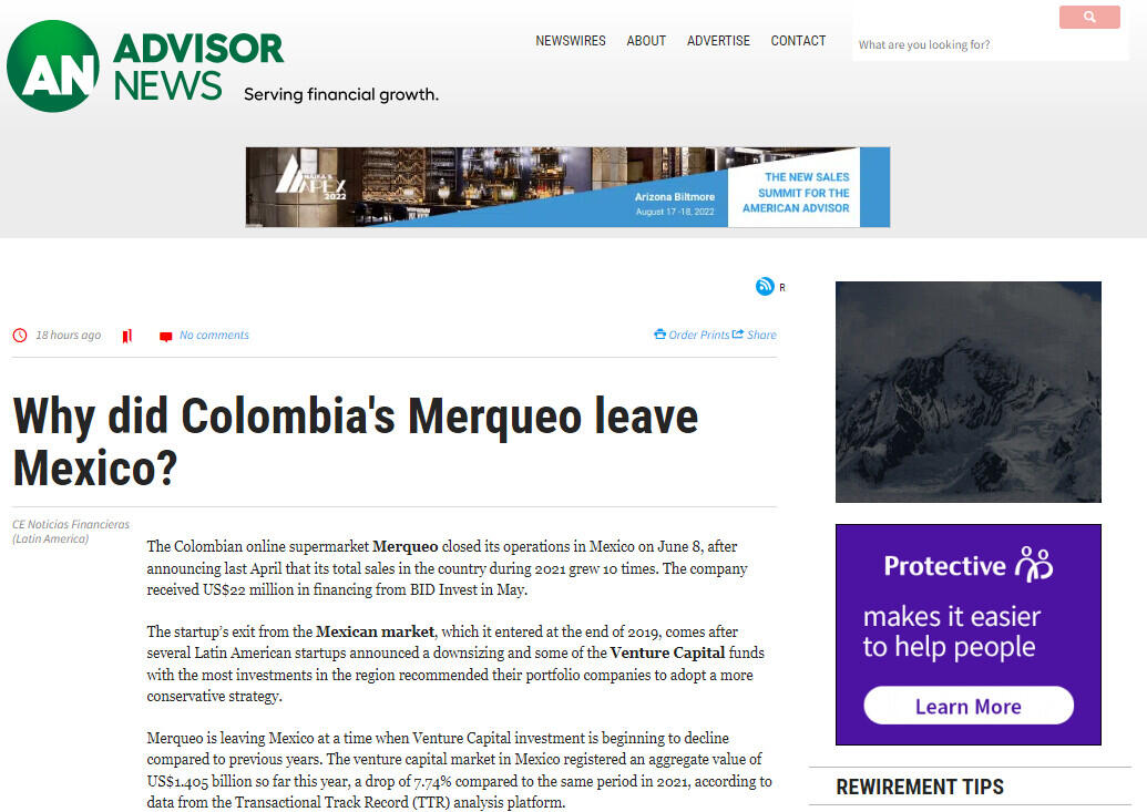 The Colombian online supermarket Merqueo closed its operations in Mexico on June 8, after announcing last April that its total sales in the country during 2021 grew 10 times. The company received US$22 million in financing from BID Invest in May.