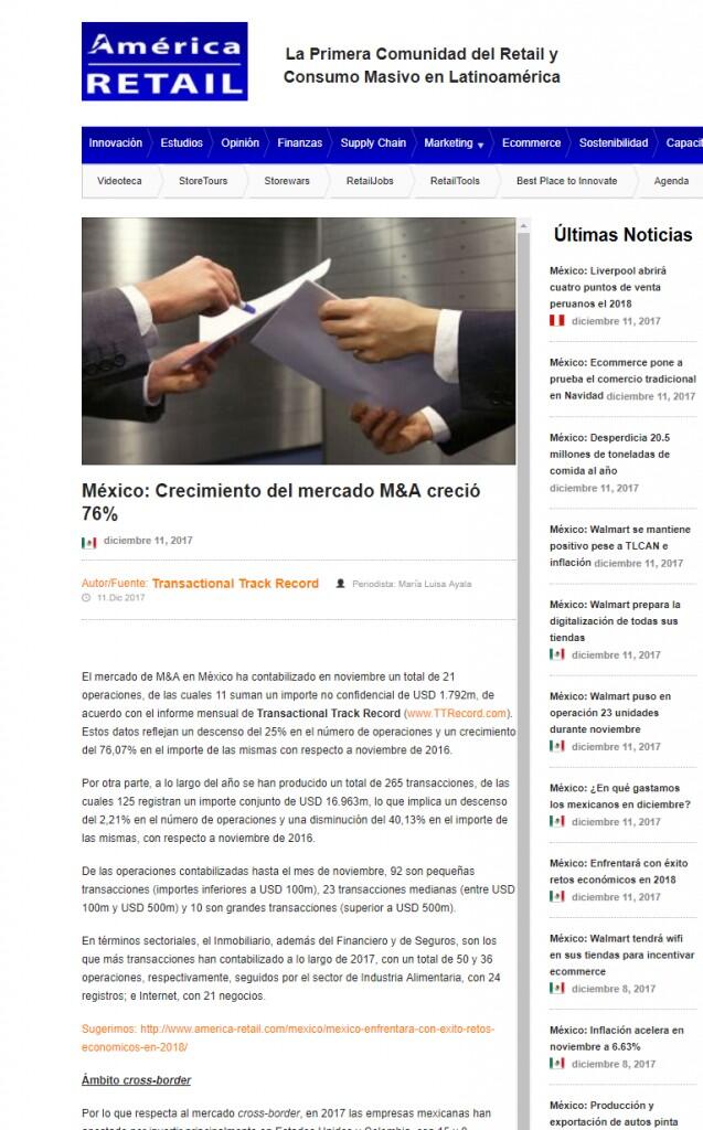 Para noviembre de 2017, Transactional Track Record ha seleccionado como operación destacada la adquisición de la filial de Kio Networks por parte de American Tower.