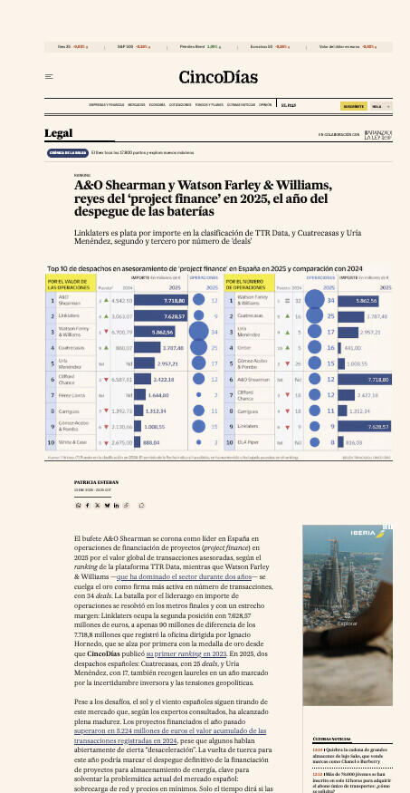 El bufete A&O Shearman se corona como líder en España en operaciones de financiación de proyectos (project finance) en 2025 por el valor global de transacciones asesoradas, según el ranking de la plataforma TTR Data, mientras que Watson Farley & Williams —que ha dominado el sector durante dos años— se cuelga el oro como firma más activa en número de transacciones, con 34 deals. La batalla por el liderazgo en importe de operaciones se resolvió en los metros finales y con un estrecho margen: Linklaters ocupa la segunda posición con 7.628,57 millones de euros, a apenas 90 millones de diferencia de los 7.718,8 millones que registró la oficina dirigida por Ignacio Hornedo, que se alza por primera con la medalla de oro desde que CincoDías publicó su primer ranking en 2023. En 2025, dos despachos españoles: Cuatrecasas, con 25 deals, y Uría Menéndez, con 17, también recogen laureles en un año marcado por la incertidumbre inversora y las tensiones geopolíticas.