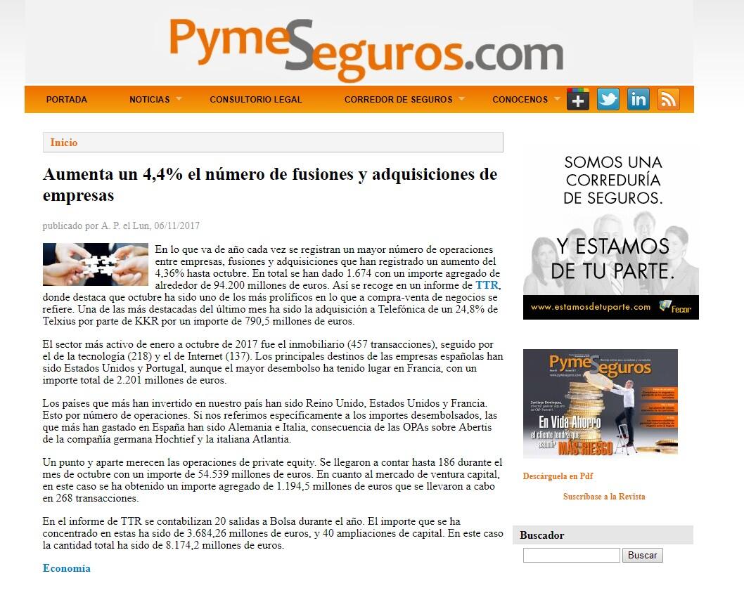 En lo que va de año cada vez se registran un mayor número de operaciones entre empresas, fusiones y adquisiciones que han registrado un aumento del 4,36% hasta octubre. En total se han dado 1.674 con un importe agregado de alrededor de 94.200 millones de euros. Así se recoge en un informe de TTR, donde destaca que octubre ha sido uno de los más prolíficos en lo que a compra-venta de negocios se refiere. Una de las más destacadas del último mes ha sido la adquisición a Telefónica de un 24,8% de Telxius por parte de KKR por un importe de 790,5 millones de euros.