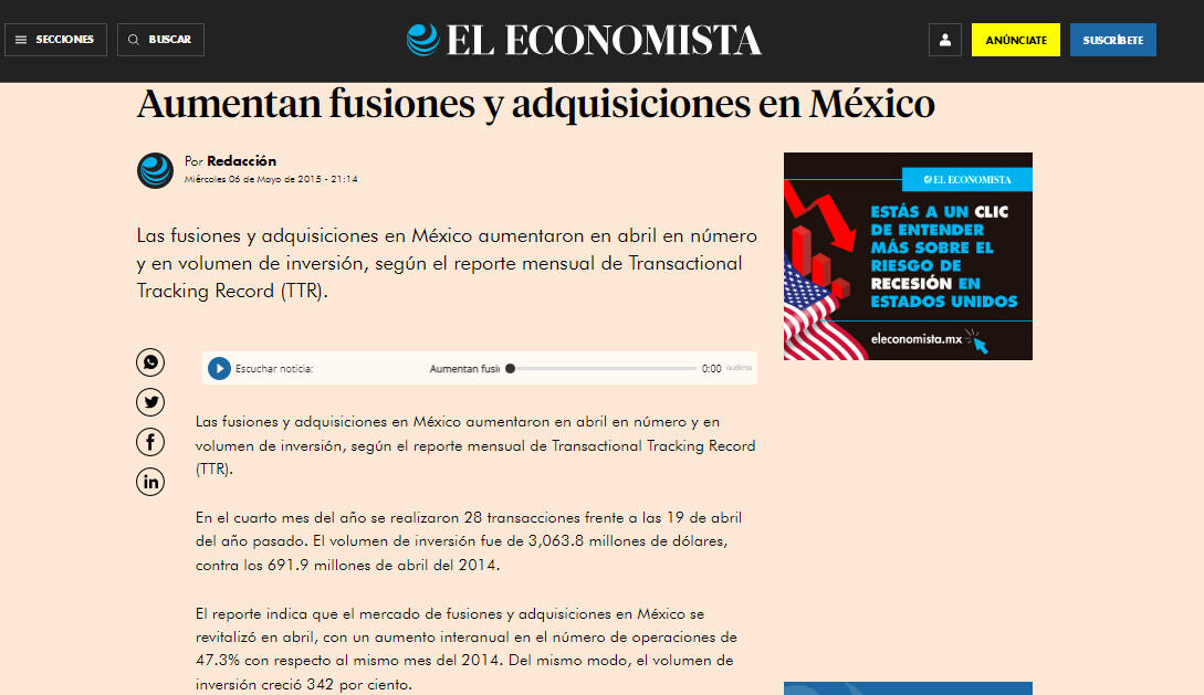El reporte indica que el mercado de fusiones y adquisiciones en México se revitalizó en abril, con un aumento interanual en el número de operaciones de 47.3% con respecto al mismo mes del 2014. Del mismo modo, el volumen de inversión creció 342 por ciento.