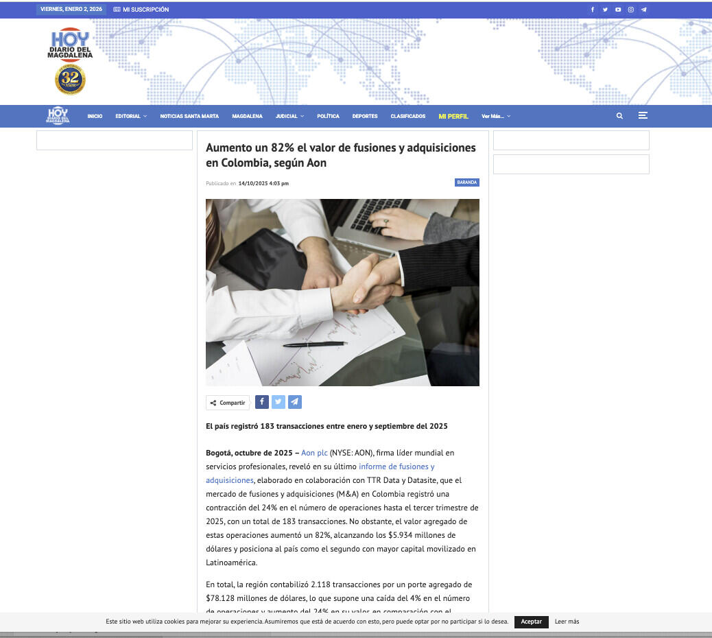 Bogotá, octubre de 2025 – Aon plc (NYSE: AON), firma líder mundial en servicios profesionales, reveló en su último informe de fusiones y adquisiciones, elaborado en colaboración con TTR Data y Datasite, que el mercado de fusiones y adquisiciones (M&A) en Colombia registró una contracción del 24% en el número de operaciones hasta el tercer trimestre de 2025, con un total de 183 transacciones. No obstante, el valor agregado de estas operaciones aumentó un 82%, alcanzando los $5.934 millones de dólares y posiciona al país como el segundo con mayor capital movilizado en Latinoamérica.