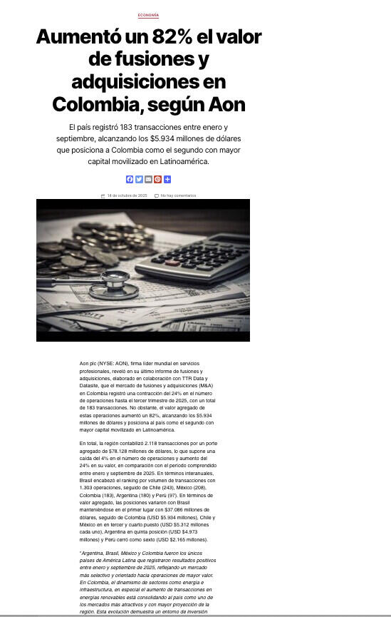 Aon plc (NYSE: AON), firma líder mundial en servicios profesionales, reveló en su último informe de fusiones y adquisiciones, elaborado en colaboración con TTR Data y Datasite, que el mercado de fusiones y adquisiciones (M&A) en Colombia registró una contracción del 24% en el número de operaciones hasta el tercer trimestre de 2025, con un total de 183 transacciones. No obstante, el valor agregado de estas operaciones aumentó un 82%, alcanzando los $5.934 millones de dólares y posiciona al país como el segundo con mayor capital movilizado en Latinoamérica.