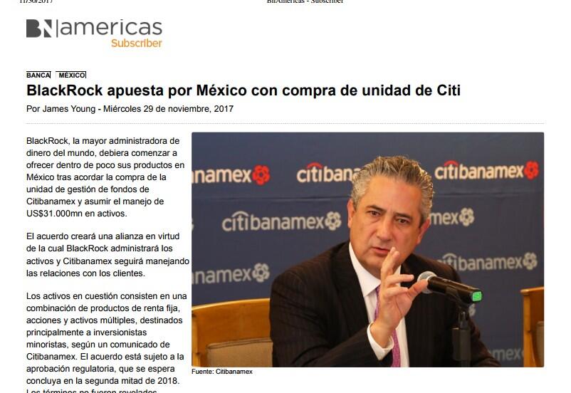 "El acuerdo con BlackRock está en línea con nuestro compromiso, al proveer a nuestros clientes los mejores servicios de administración de activos y dar a BlackRock acceso a nuestra extensa red en México".