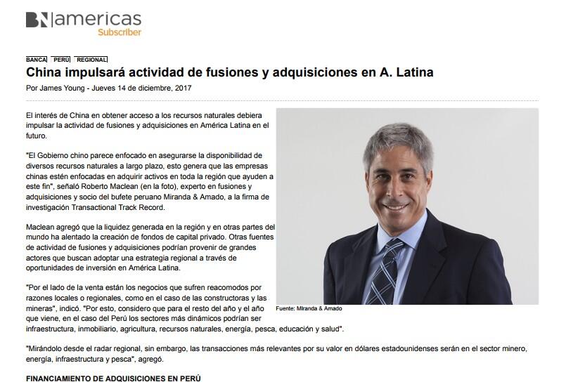 "El Gobierno chino parece enfocado en asegurarse la disponibilidad de diversos recursos naturales a largo plazo, esto genera que las empresas chinas estén enfocadas en adquirir activos en toda la región que ayuden a este fin", señaló Roberto Maclean (en la foto), experto en fusiones y adquisiciones y socio del bufete peruano Miranda & Amado, a la firma de investigación Transactional Track Record.