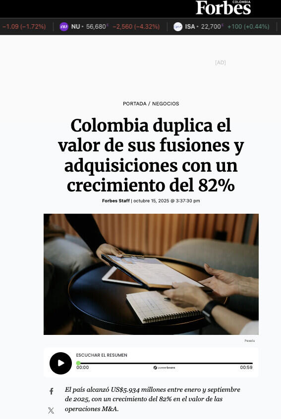 Los datos son claros: Colombia está atravesando una etapa de maduración en su mercado de fusiones y adquisiciones. La disminución en el número de transacciones, lejos de ser una señal negativa, refleja una sofisticación del mercado donde prima la calidad sobre la cantidad. Con casi US$6.000 millones movilizados en solo nueve meses y posicionándose como el segundo país más importante de Latinoamérica por capital invertido, Colombia demuestra que está en el radar de los grandes inversionistas globales.