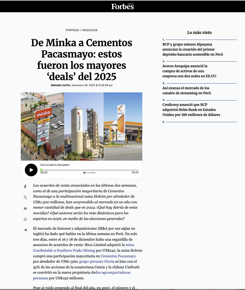 Los acuerdos de venta anunciados en las últimas dos semanas, como el de una participación mayoritaria de Cementos Pacasmayo a la multinacional suiza Holcim por alrededor de US$1.500 millones, han sorprendido al mercado en un año con menor cantidad de deals que en 2024. ¿Qué hay detrás de estas movidas? ¿Qué sectores serán los más dinámicos para los expertos en 2026, en medio de las elecciones generales?
