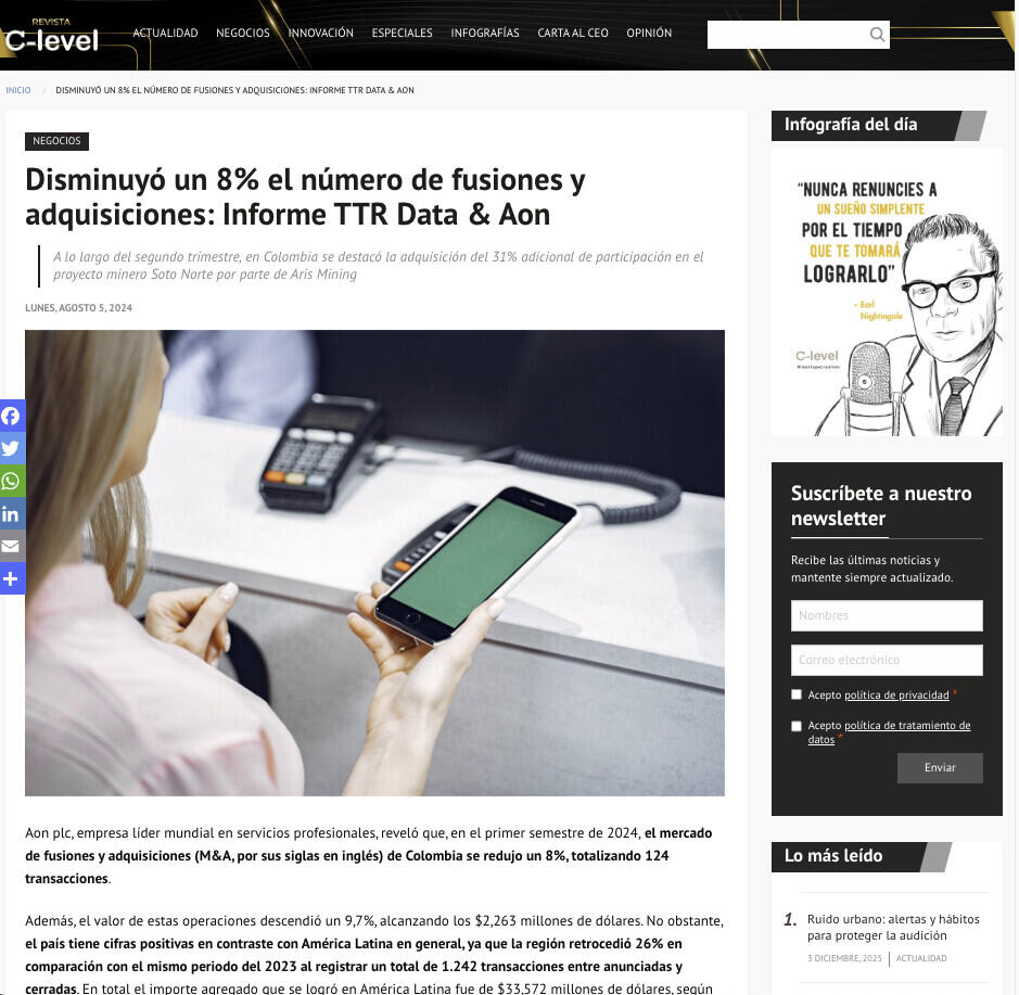 Para obtener más información sobre el reciente informe de América Latina 2024 sobre fusiones y adquisiciones, realizado por Aon y TTR data, consúltelo aquí.
