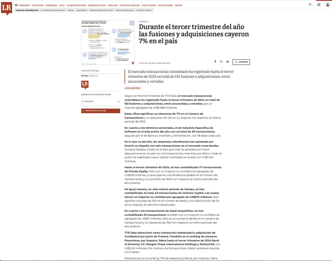 TTR Data seleccionó como transacción destacada la adquisición de Confipetrol por parte de Protexa. También en el ranking de asesores financieros, por importe, lidera hasta el tercer trimestre de 2024 Bank of America; J.P. Morgan Chase International Holdings y Rothschild, con US$1.241 millones. Por número de transacciones, lidera Landmark Alantra, con 5 deals.