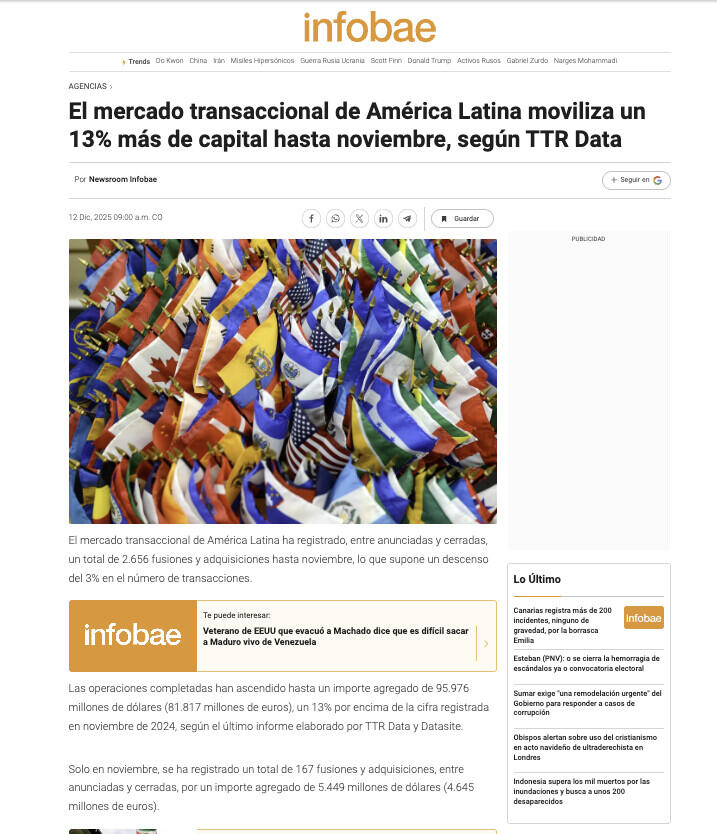 El mercado transaccional de América Latina moviliza un 13% más de capital hasta noviembre, según TTR Data