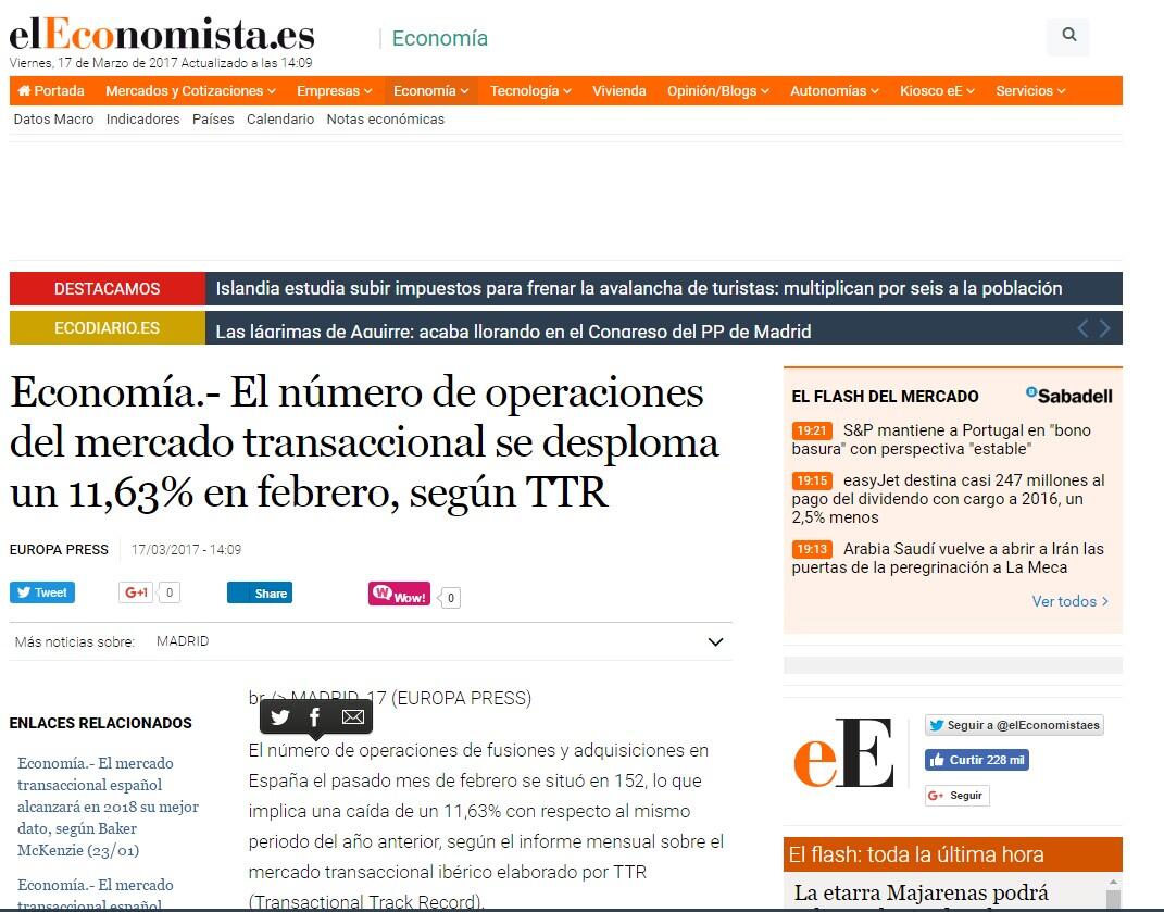 En cuanto al dato acumulado en los dos primeros meses de 2017, el mercado transaccional en España registró un total de 308 operaciones de fusiones y adquisiciones, lo que supone un incremento del 1,65% con respecto al mismo periodo del año anterior.