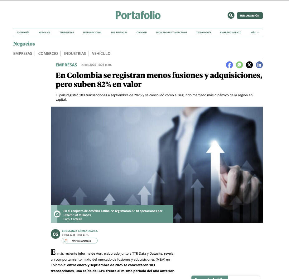 El más reciente informe de Aon, elaborado junto a TTR Data y Datasite, revela un comportamiento mixto del mercado de fusiones y adquisiciones (M&A) en Colombia: entre enero y septiembre de 2025 se concretaron 183 transacciones, una caída del 24% frente al mismo periodo del año anterior.
