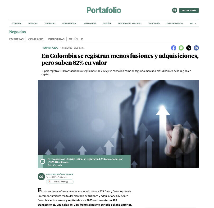 El más reciente informe de Aon, elaborado junto a TTR Data y Datasite, revela un comportamiento mixto del mercado de fusiones y adquisiciones (M&A) en Colombia: entre enero y septiembre de 2025 se concretaron 183 transacciones, una caída del 24% frente al mismo periodo del año anterior.
