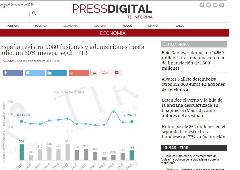 El mercado transaccional español ha registrado 1.080 fusiones y adquisiciones, anunciadas y cerradas, entre enero y julio, un 30% menos que en el ese periodo de 2019, según TTR.
