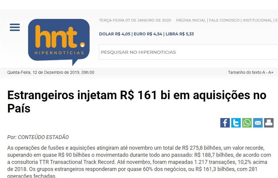 As operações de fusões e aquisições atingiram até novembro um total de R$ 275,8 bilhões, um valor recorde, superando em quase R$ 90 bilhões o movimentado durante todo ano passado: R$ 188,7 bilhões, de acordo com a consultoria TTR Transactional Track Record. Até novembro, foram mapeadas 1.217 transações, 10,2% acima de 2018. Os grupos estrangeiros responderam por quase 60% dos negócios, ou R$ 161,3 bilhões, com 281 operações fechadas.