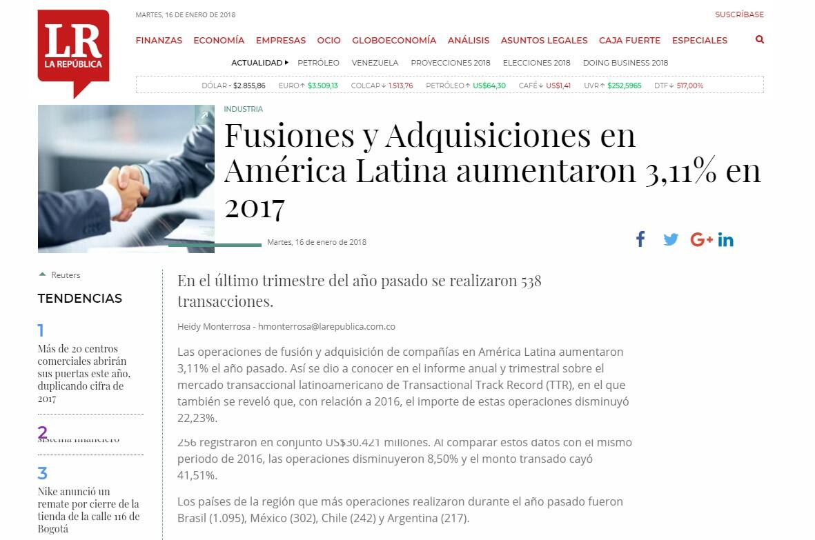 Las operaciones de fusión y adquisición de compañías en América Latina aumentaron 3,11% el año pasado. Así se dio a conocer en el informe anual y trimestral sobre el mercado transaccional latinoamericano de Transactional Track Record (TTR), en el que también se reveló que, con relación a 2016, el importe de estas operaciones disminuyó 22,23%.