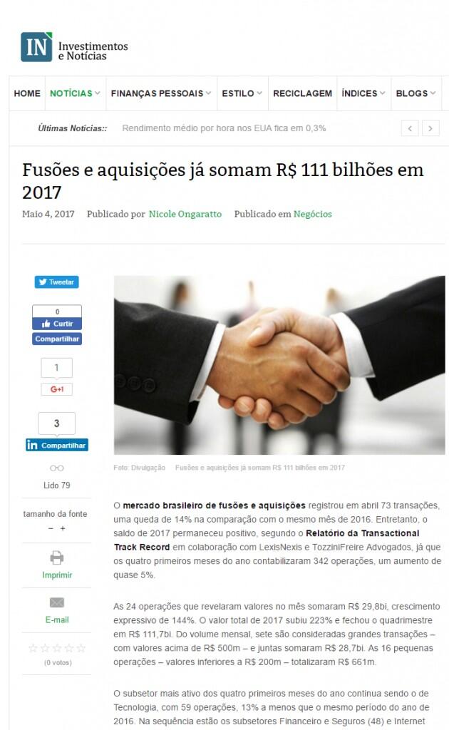 O mercado brasileiro de fusões e aquisições registrou em abril 73 transações, uma queda de 14% na comparação com o mesmo mês de 2016. Entretanto, o saldo de 2017 permaneceu positivo, segundo o Relatório da Transactional Track Record em colaboração com LexisNexis e TozziniFreire Advogados, já que os quatro primeiros meses do ano contabilizaram 342 operações, um aumento de quase 5%.
