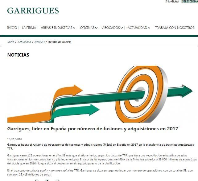 Garrigues lidera el ranking de operaciones de fusiones y adquisiciones (M&A) en España en 2017 en la plataforma de business intelligence TTR.