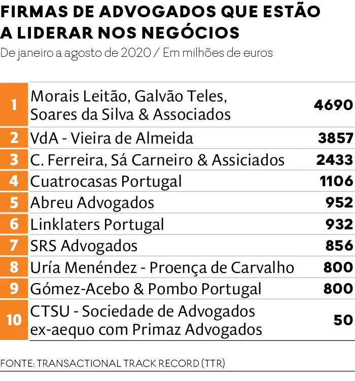 Na assessoria jurídica, a firma Morais Leitão é a mais dinâmica em termos de montante global dos negócios em que participou, num total de 4690 milhões de euros que dizem respeito a 16 operações, seguindo-se a Vieira de Almeida (VdA), com 3857 milhões de euros (nove transações) e, em terceiro, a Campos Ferreira, Sá Carneiro, com 2433 milhões de euros, gerados apenas com um único contrato. Já em 2019, o escritório Morais Leitão, liderado por Nuno Galvão Teles, havia liderado este ranking.