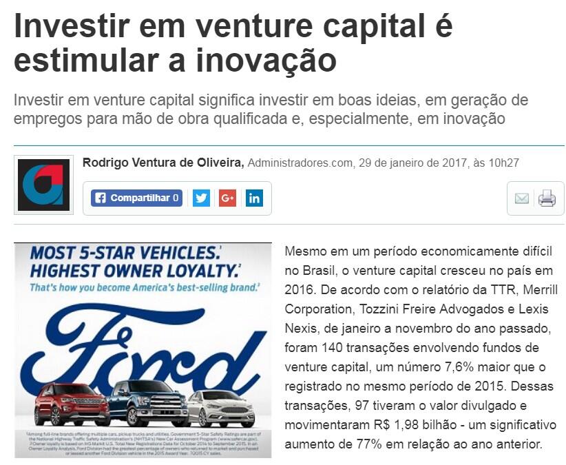 Mesmo em um período economicamente difícil no Brasil, o venture capital cresceu no país em 2016. De acordo com o relatório da TTR, Merrill Corporation, Tozzini Freire Advogados e Lexis Nexis, de janeiro a novembro do ano passado, foram 140 transações envolvendo fundos de venture capital, um número 7,6% maior que o registrado no mesmo período de 2015. Dessas transações, 97 tiveram o valor divulgado e movimentaram R$ 1,98 bilhão - um significativo aumento de 77% em relação ao ano anterior.