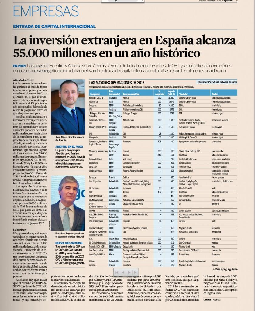 Hay que reseñar que el impulso se debe en buena parte a la opa sobre Abertis, que supone –sin incluir los más de 15.000 millones de deuda de la concesionaria–, un tercio de la inversión exterior en 2017. Como no se conoce el desenlace de la guerra de opas, sólo se incluye la oferta más alta hasta la fecha en la cifra global, aunque ambos contendientes van a elevar sus respectivas propuestas.