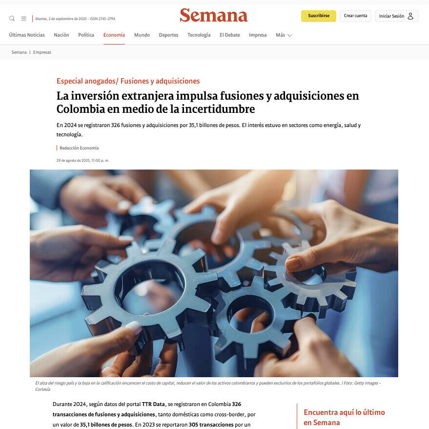 Durante 2024, según datos del portal TTR Data, se registraron en Colombia 326 transacciones de fusiones y adquisiciones, tanto domésticas como cross-border, por un valor de 35,1 billones de pesos. En 2023 se reportaron 305 transacciones por un valor total de 22,2 billones de pesos.