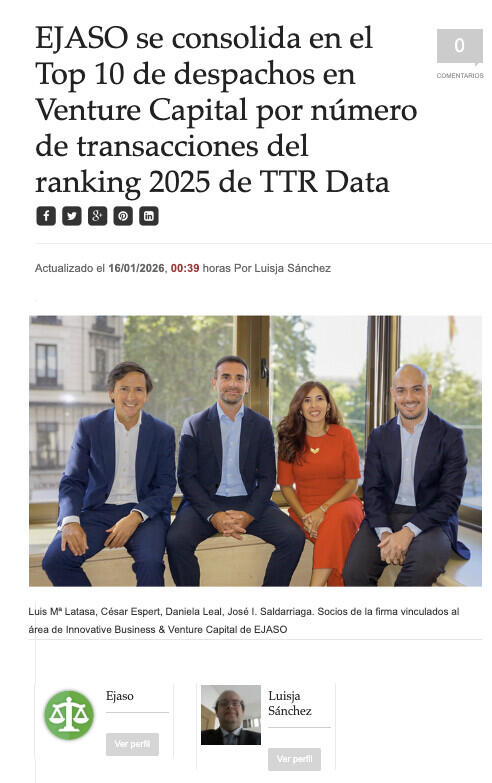 EJASO vuelve a posicionarse entre los diez primeros despachos de abogados en Venture Capital por número de transacciones en España, según el Ranking 2025 elaborado por TTR Data (Transactional Track Record), uno de los informes de referencia del mercado de M&A y Venture Capital a nivel nacional e internacional.