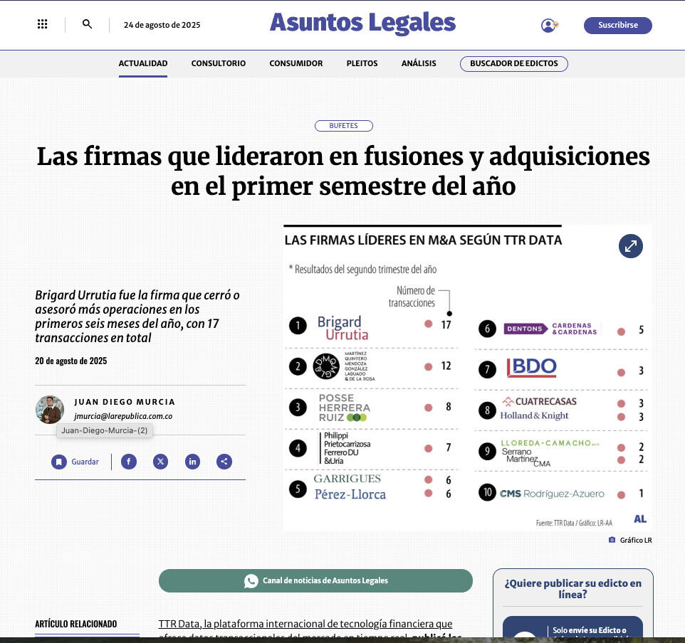 Brigard Urrutia fue la firma que cerró o asesoró más operaciones en los primeros seis meses del año, con 17 transacciones en total