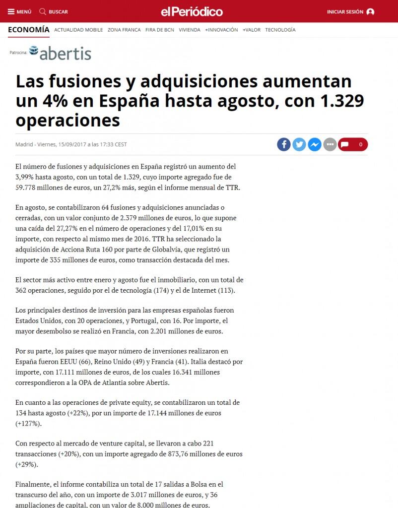 En agosto, se contabilizaron 64 fusiones y adquisiciones anunciadas o cerradas, con un valor conjunto de 2.379 millones de euros, lo que supone una caída del 27,27% en el número de operaciones y del 17,01% en su importe, con respecto al mismo mes de 2016. TTR ha seleccionado la adquisición de Acciona Ruta 160 por parte de Globalvía, que registró un importe de 335 millones de euros, como transacción destacada del mes.