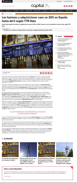 El mercado español de fusiones y adquisiciones cayó un 20% en 2025, siendo el sector inmobiliario el más activo, según TTR Data.
