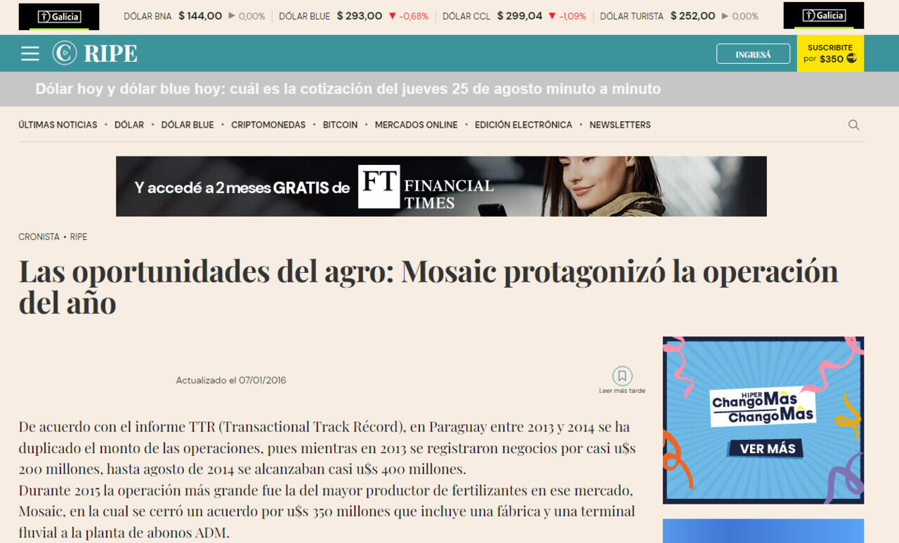Durante 2015 la operación más grande fue la del mayor productor de fertilizantes en ese mercado, Mosaic, en la cual se cerró un acuerdo por u$s 350 millones que incluye una fábrica y una terminal fluvial a la planta de abonos ADM.