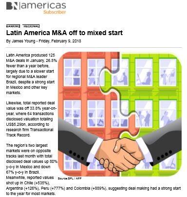 Latin America produced 125 M&A deals in January, 26.5% fewer than a year before, largely due to a slower start for regional M&A leader Brazil, despite a strong start in Mexico and other key markets.