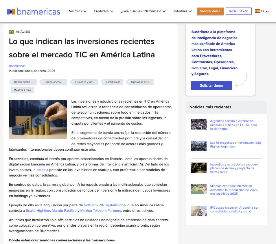 Ejemplo de ello es la adquisición por parte de SoftBank de DigitalBridge, que en América Latina controla a Scala, Highline, Mundo Pacífico y Mexico Telecom Partners, entre otros activos.