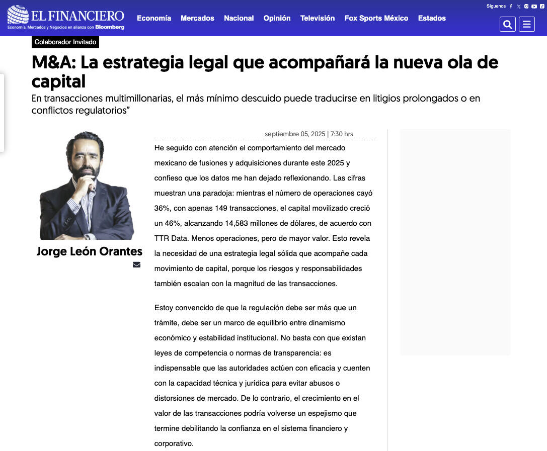 He seguido con atención el comportamiento del mercado mexicano de fusiones y adquisiciones durante este 2025 y confieso que los datos me han dejado reflexionando. Las cifras muestran una paradoja: mientras el número de operaciones cayó 36%, con apenas 149 transacciones, el capital movilizado creció un 46%, alcanzando 14,583 millones de dólares, de acuerdo con TTR Data. Menos operaciones, pero de mayor valor. Esto revela la necesidad de una estrategia legal sólida que acompañe cada movimiento de capital, porque los riesgos y responsabilidades también escalan con la magnitud de las transacciones.