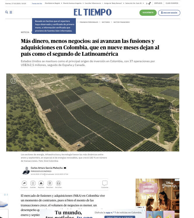 En el caso colombiano, la transición energética y el desarrollo de infraestructura pública y privada han sido determinantes para atraer nuevos capitales. Las operaciones en energías limpias, transmisión eléctrica y proyectos sostenibles no solo impulsan el volumen de inversiones, sino que también consolidan a Colombia como un destino clave dentro del mapa de fusiones y adquisiciones de América Latina.