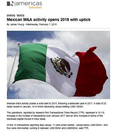 Mexican M&A activity posted a solid start to 2018, following a lackluster year in 2017. A total of 25 deals closed in January, 19 of which disclosing values totaling US$1.582bn.