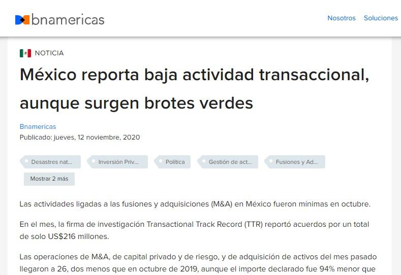 En momentos en que el sector privado se concentra en absorber el impacto de la pandemia, "se ve en TTR que ha surgido un flujo interesante de operaciones en México como efecto de la venta de activos no estratégicos con el objetivo de otorgar a las empresas una estabilidad en su estructura de capital", explicó Chacón.