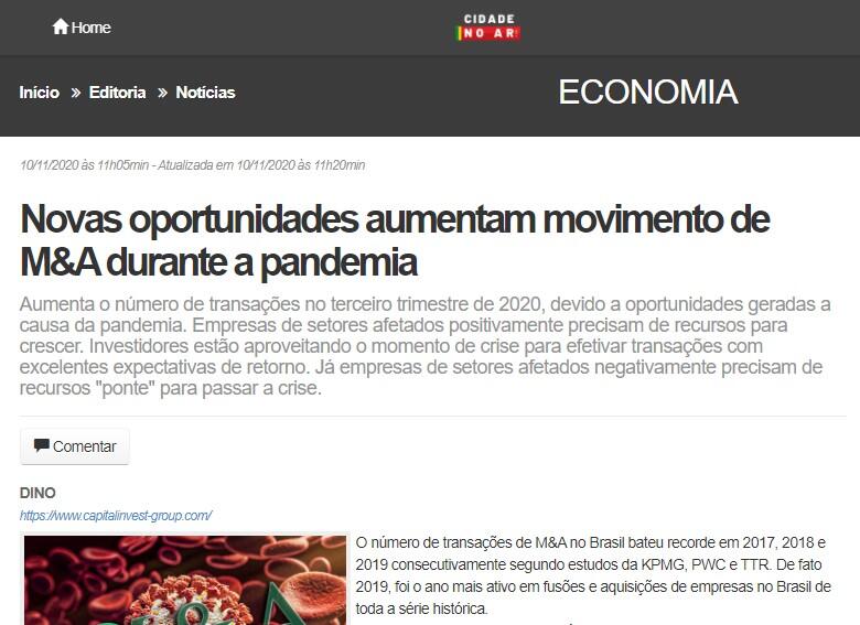 Segundo a CAPITAL INVEST - M&A Advisors, uma das principais boutiques de M&A do Brasil, inicialmente os sócios de empresas e investidores foram surpreendidos pelo impacto da pandemia, e algumas transações em andamento foram adiadas. Após meses de pandemia, e já com a perspectiva de uma vacina e houve retomada das negociações adiadas, e novas oportunidades.