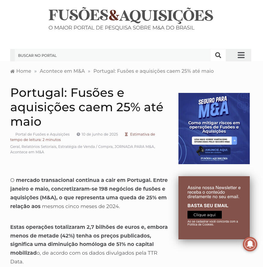 O mercado transacional continua a cair em Portugal. Entre janeiro e maio, concretizaram-se 198 negócios de fusões e aquisições (M&A), o que representa uma queda de 25% em relação aos mesmos cinco meses de 2024.