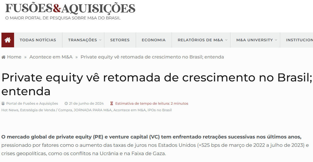 Recentemente, o mercado brasileiro apresentou um movimento de retração semelhante ao observado globalmente. Entre janeiro e maio de 2024, os investimentos em private equity no Brasil somaram R$ 5,4 bilhões, uma queda de 19,4% em relação ao mesmo período de 2023, segundo a TTR Data.
