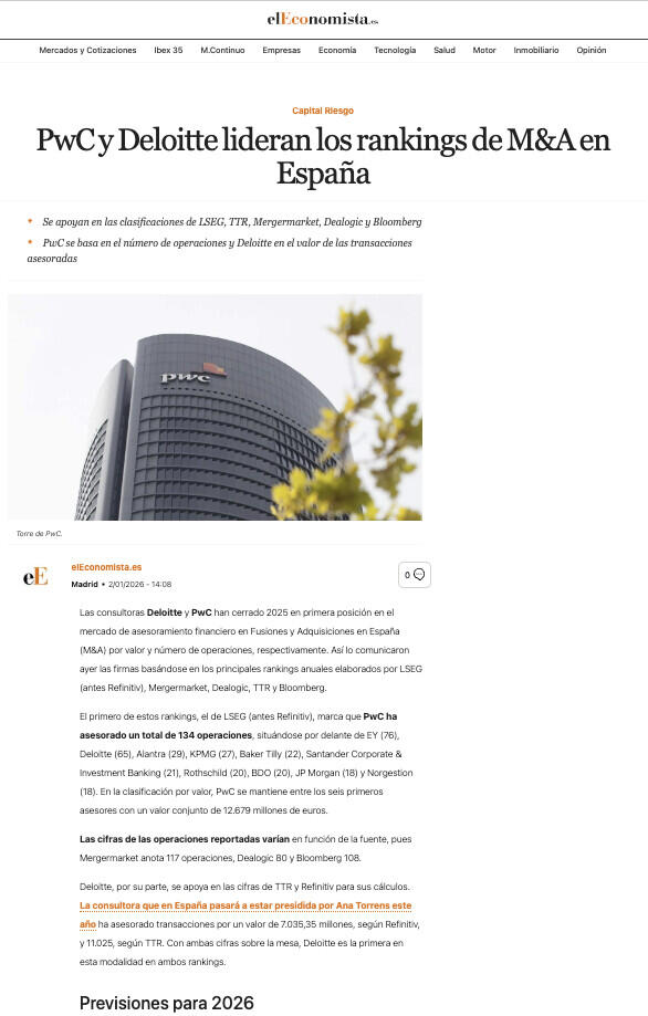 Las consultoras Deloitte y PwC han cerrado 2025 en primera posición en el mercado de asesoramiento financiero en Fusiones y Adquisiciones en España (M&A) por valor y número de operaciones, respectivamente. Así lo comunicaron ayer las firmas basándose en los principales rankings anuales elaborados por LSEG (antes Refinitiv), Mergermarket, Dealogic, TTR y Bloomberg.