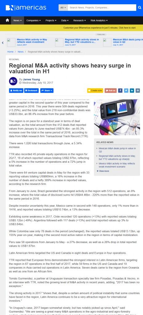 TTR reported that European firms demonstrated the strongest interest in Latin American firms, targeting the region in 67 operations in the first half of 2017, while 59 firms in the US and Canada and 19 companies in Asia carried out operations in Latin America. Seven deals came to the region from Oceanía as well as one from an African firm.