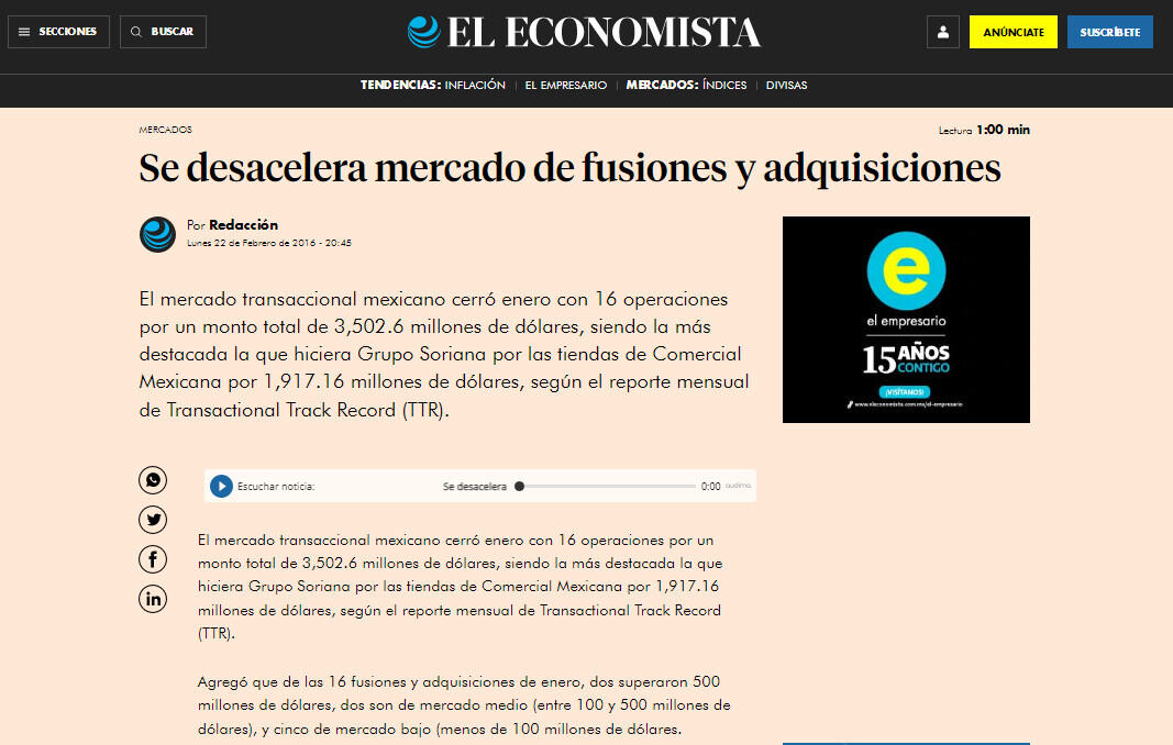 El mercado transaccional mexicano cerró enero con 16 operaciones por un monto total de 3,502.6 millones de dólares, siendo la más destacada la que hiciera Grupo Soriana por las tiendas de Comercial Mexicana por 1,917.16 millones de dólares, según el reporte mensual de Transactional Track Record (TTR).