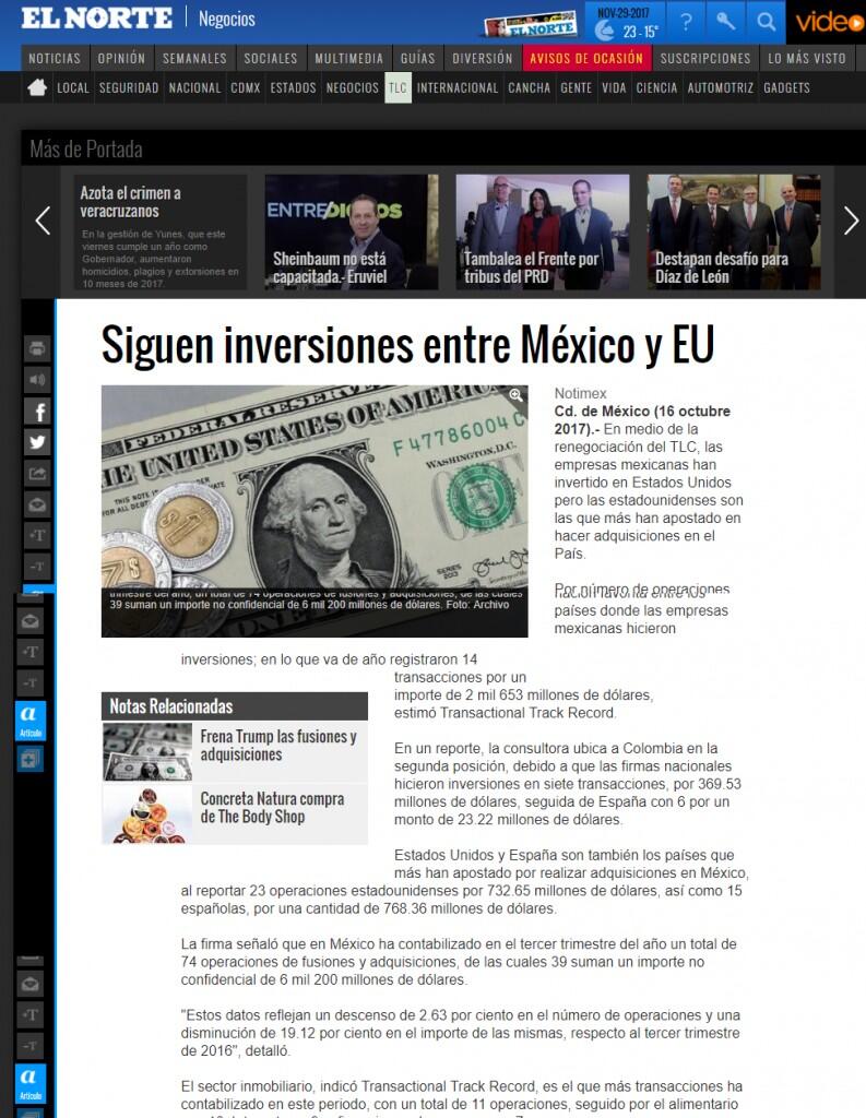 Por número de operaciones, EU se ha posicionado como la nación favorita entre los países donde las empresas mexicanas hicieron inversiones; en lo que va de año registraron 14 transacciones por un importe de 2 mil 653 millones de dólares, estimó Transactional Track Record.