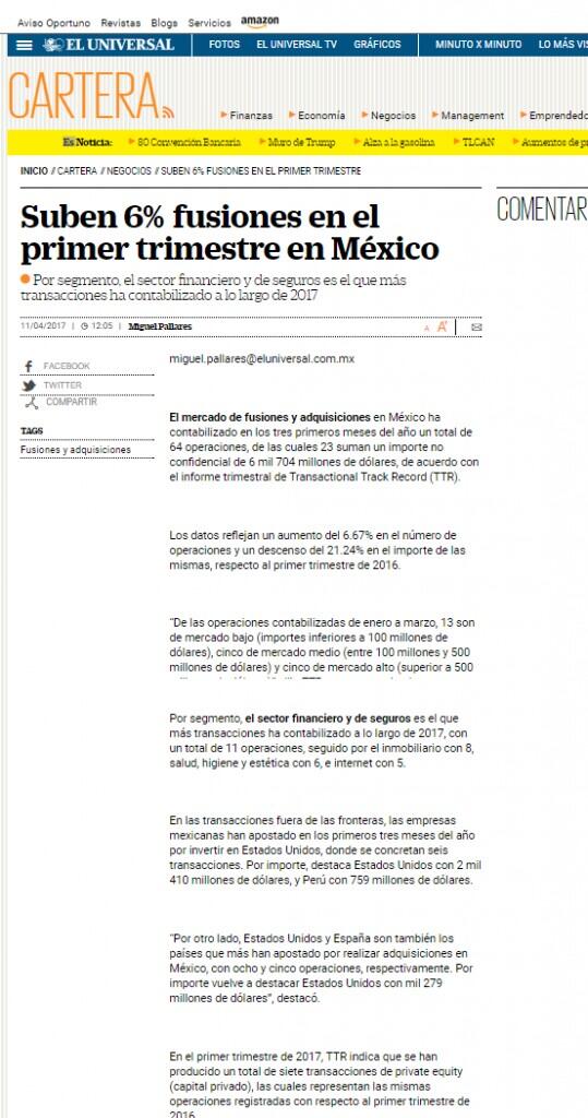 "Para el primer trimestre de 2017, Transactional Track Record ha seleccionado como operación destacada la realizada por Delta Air Lines, en la cual se concluye la OPA sobre el Grupo Aeroméxico", indicó la firma.